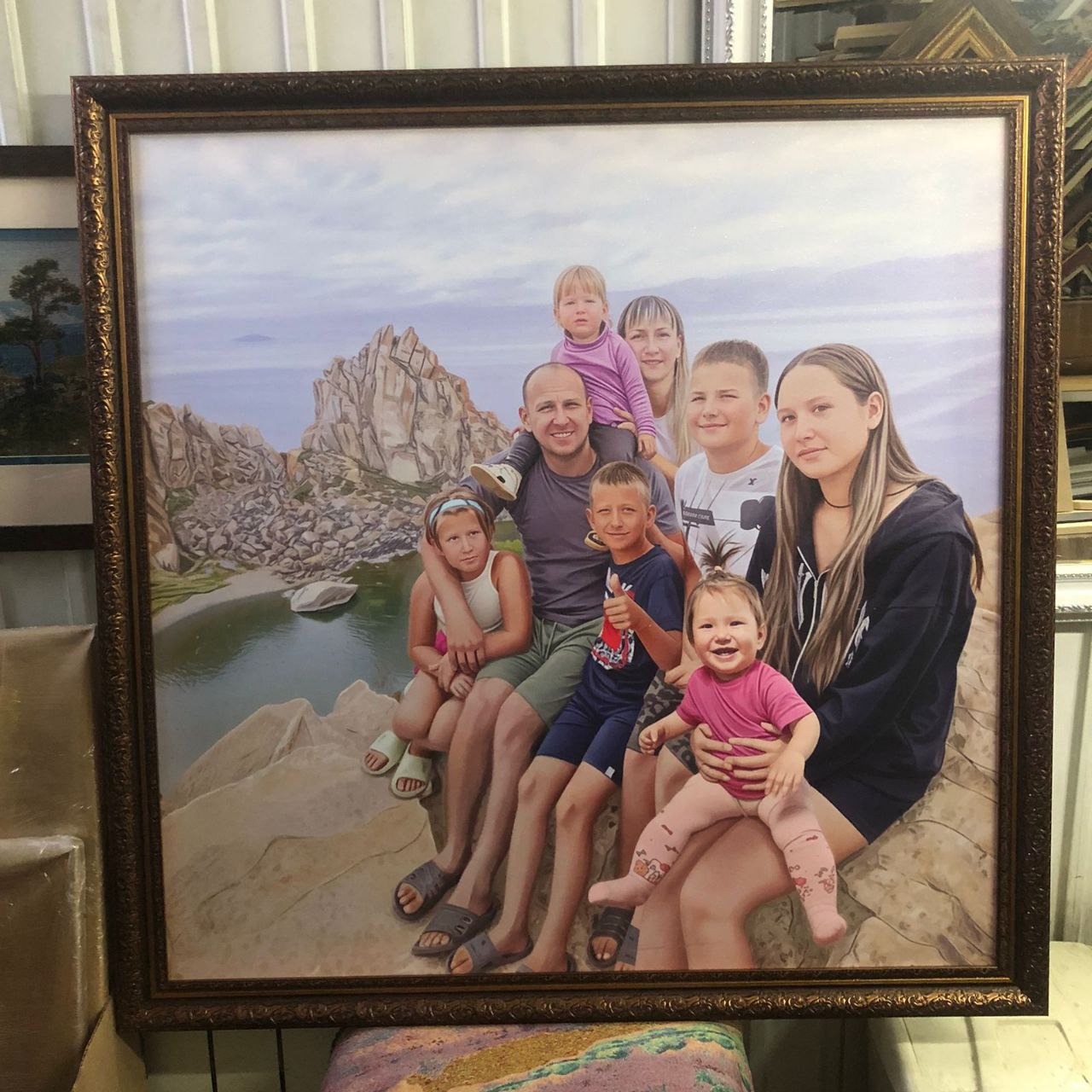 Всё портреты оформляем в багетные рамы. В результате они смотрятся как настоящие картины, которые не стыдно дарить.