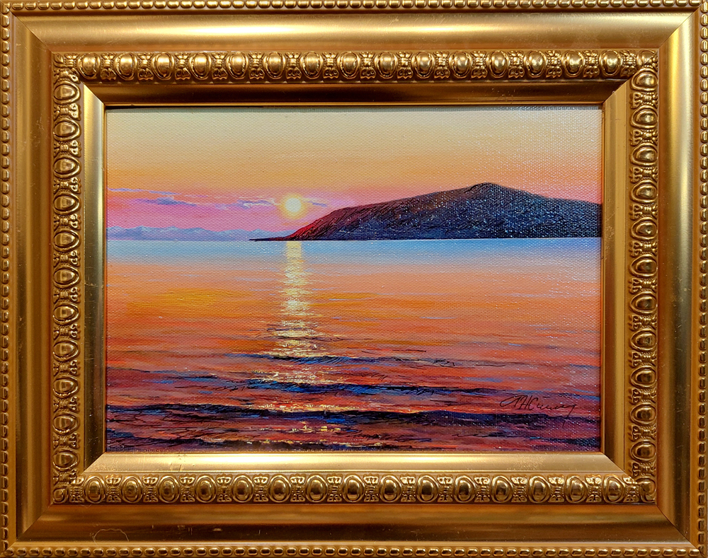Картина выполнена акрилом на холсте, в багетной раме, 15х21 см. На выбор предлагаем 2 варианта рам.